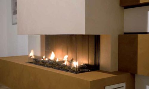 Panoramiczny kominek gazowy o szybach z 3 stron. Wnętrze w standardzie z blachy gładkiej lub paneli metalowych, opcjonalnie z czarnego lustra ceramicznego pogłębiającego wizję ognia. Standardowo wyposażony w polana ceramiczne imitujące drewno kominkowe, opcjonalnie z czarnego lustra ceramicznego pogłębiając wizję ognia. Standardowo wyposażono w polana ceramiczne imitujące drewno kominkowe, opcjonalnie do wyboru kamienie, kamienie Carrara lub bazalt.